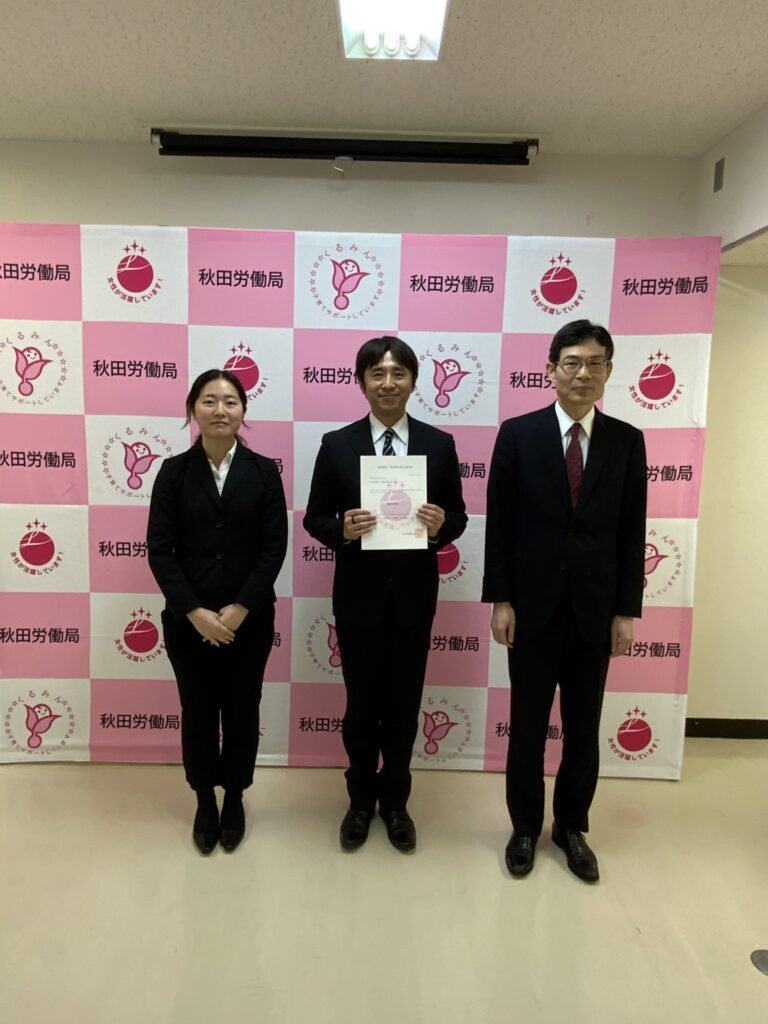 先日、秋田労働局長より認定通知書の授与を受けました。